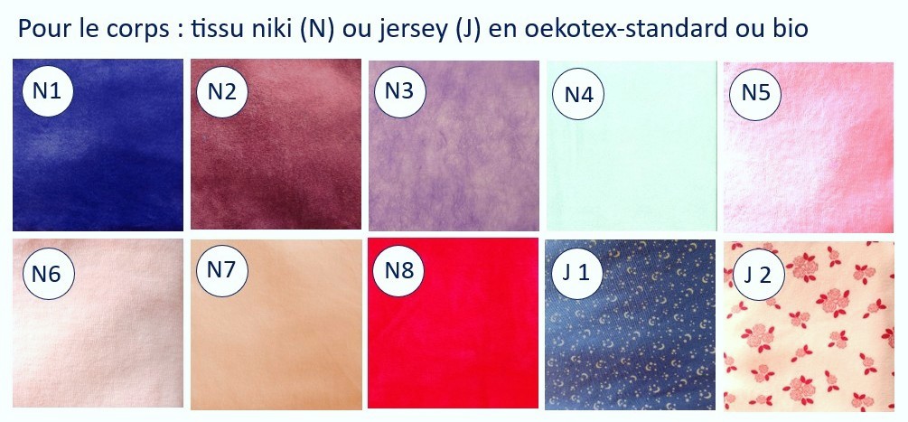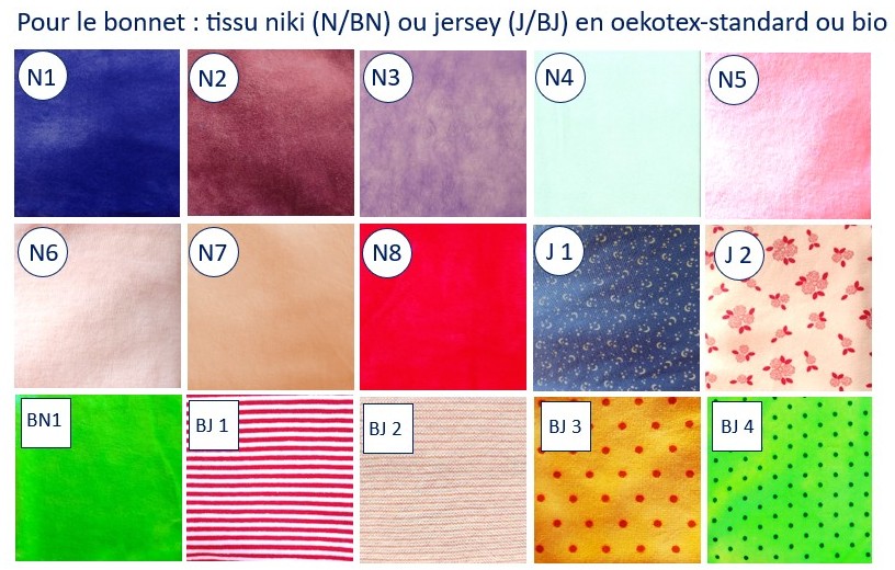 N 1 bleu foncé, bleu royal, Niki, oekotex standard – N 2 bordeaux-violet un peu plus clair comme #6E0037 Niki oekotex st. – N 3 lilas clair, rayonnant, Niki, oekotex st. – N 4 bleu glacier clair ou bleu menthe clair, Niki oekotex st. – N 5 pink clair, Niki, oekotex, la structure de la surface n’est pas aussi fine, c’est un peu robuste, mais reste néanmoins douce – N 6 rose très, très clair Niki bio – N 7 abricot clair, direction #FFD88B, Niki bio – N 8 rouge « pompier », Niki oekotex st. – J 1 bleu foncé, indigo, tissu jersey fin, imprimé, avec de minuscules lunes et étoiles, envers bleu uni – J 2 rose, imprimé avec des petites roses en rouge, jersey bio épais, envers couleur crème-blanc