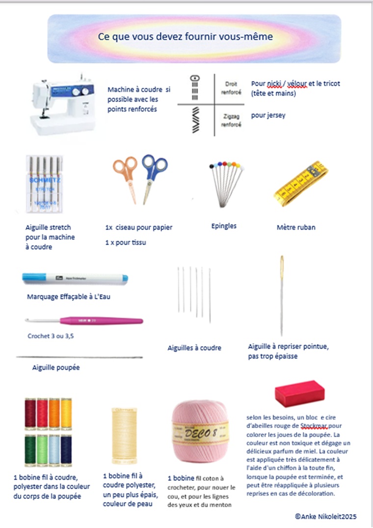 Remarque : Il s’agit ici d’un kit, matériel et instructions pour coudre soi-même une (1) poupée. La livraison ne comprend pas de poupée.