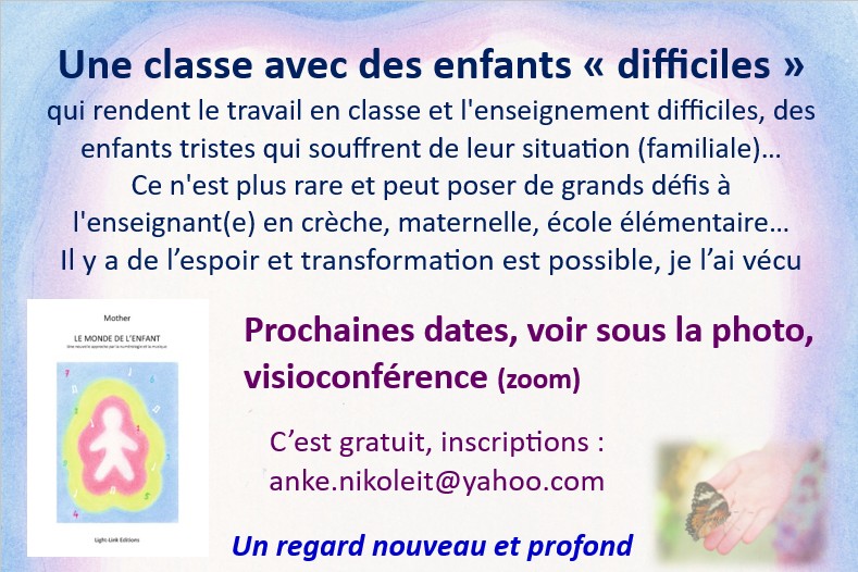 Visioconférence, pour enseignant(e)s et maitresses à l’élémentaire, maternelle et crèche. Présentation d’un nouveau regard sur l’enfant et son chemin sur la Terre, sur la relation merveilleuse entre le prof et ses élèves, sur les situations difficiles en classe avec des enfants « difficiles ». Présentation une nouvelle approche qui se base sur ce nouveau regard, avec une nouvelle numérologie et des chansons nouvelles, harmonisantes. Participation gratuit. Pour plus infos …