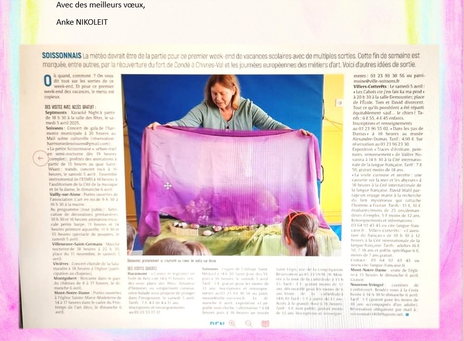 Animation: petit théâtre de marionnettes pour la maternelle et la crèche. Accompagné de chansons pour enfants, de musique de la petite harpe, selon des possibilitées d’une chanson gestuelle, un jeu de doigts. Le contenu des pièces de théâtre est adapté aux thèmes de la saison, avec des figurines que j’ai créées. Plus d’informations pour la période précédant Noël et l’hiver et des conditions…